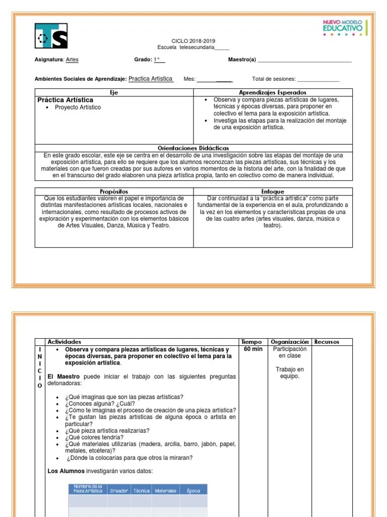 Elabora ejercicios artísticos explorando los elementos básicos de las artes, así como los materiales y técnicas de las artes visuales, para elaborar una obra artística de manera individual o en grupo. Investiga las etapas para la realización del montaje de una exposición. A continuación se describen las planificaciones de telesecundaria según el contenido en cada materia.. Planeaciones de telesecundaria de artes visuales.